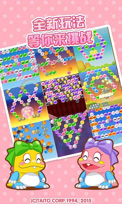 泡泡龙官方正版2015简介:-->IOS官方推荐,下载榜TOP2,最正宗的泡泡龙来袭!作为唯一官方正版的《泡泡龙》,独具匠心的关卡设计带来了其他抄袭作品所不具备的原汁原味。《泡泡龙》上线的第一时间,有上百个趣味关卡跟大家见面,随着后续关卡的更新,总计会有超过300个不同关卡任大家畅玩。《泡泡龙》作为一款风靡20年的经典消除类游戏,承载了众多玩家的梦想,充满童年回忆的泡泡龙勾起了我们美好的回忆,相信一定能够唤回老玩家们再度重温那段打泡泡的美好时光 。双“旦”新版抽奖活动开启,快来一起愉快的玩耍吧!